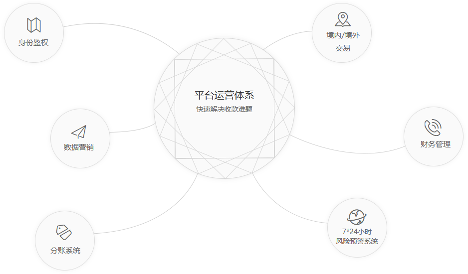 入网申请、综合交易、多层管理、风险管控、监测预警、收款终端、收银系统、7*24运维等完善的服务流程